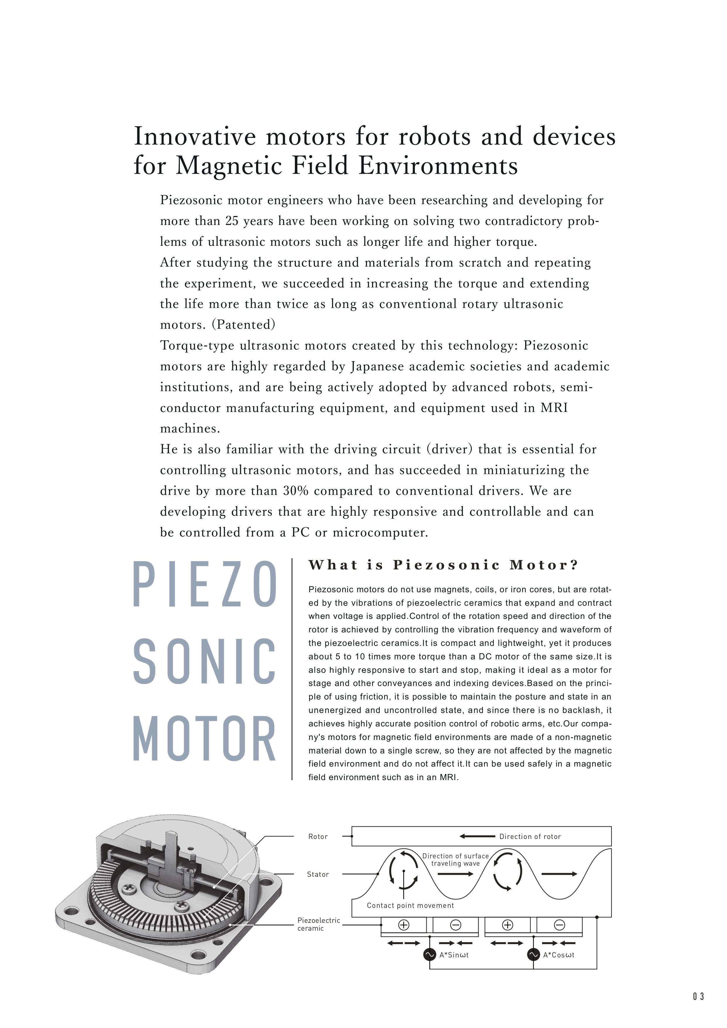 傳統馬達通常依賴磁場進行運作,而 Piezo Sonic 的馬達完全不依賴磁場,這使其適合用於磁場敏感的環境(如 MRI 設備或一些科學實驗)。